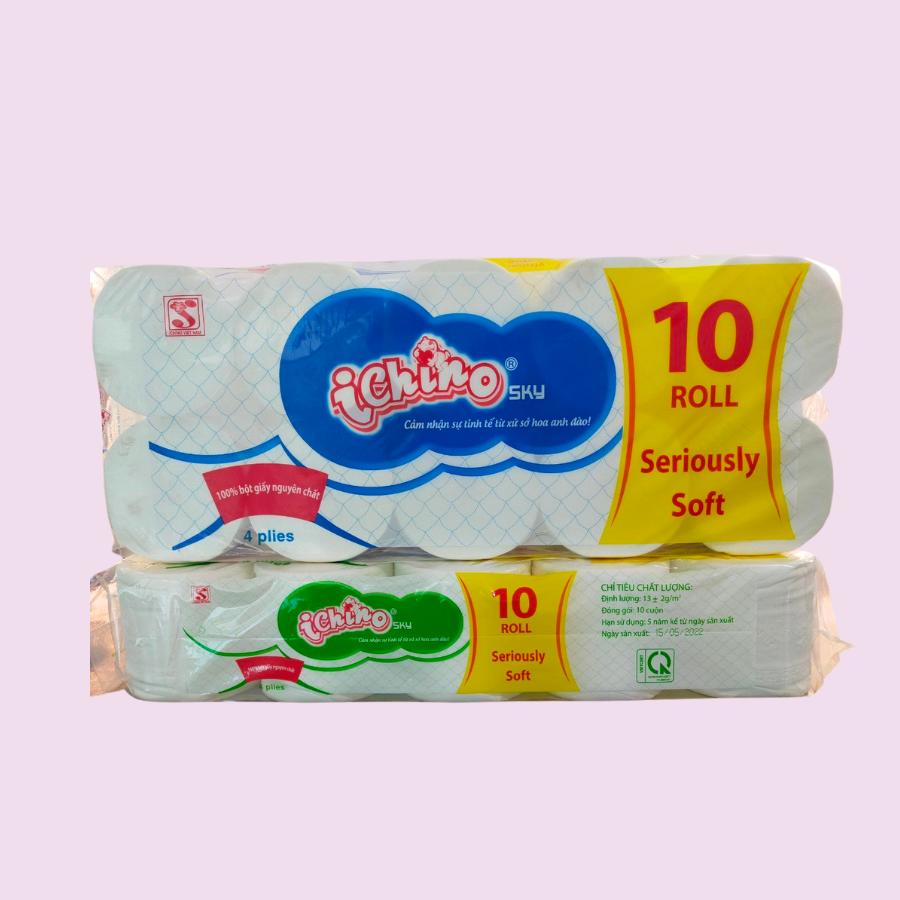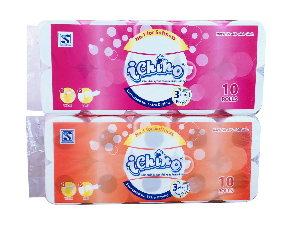 Giấy vệ sinh Ichino được đóng gói theo dạng bịch, có thể là 6 hoặc 10 cuộn. Mỗi cuộn có từ 2 đến 3 lớp và có hoặc không có lõi. Sản phẩm này rất tiện dụng để sử dụng hàng ngày tại nhà, văn phòng hoặc trường học.