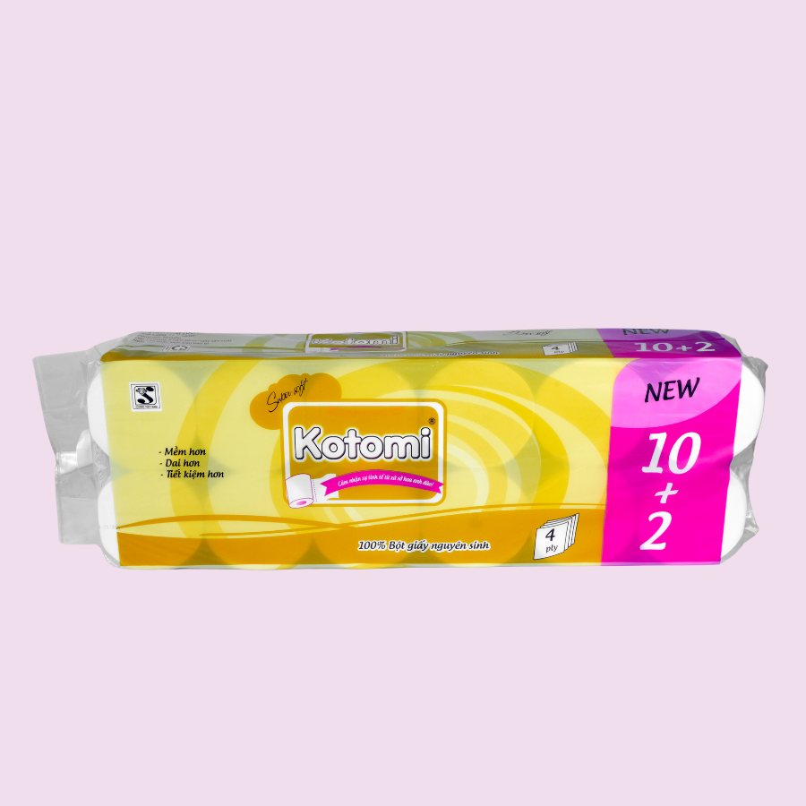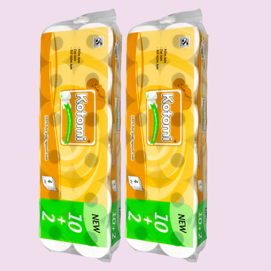 Thương hiệu Kotomi nổi tiếng, chất lượng cao, mềm mại, dai, thấm hút tốt. Mỗi lốc giấy 12 cuộn được bán với giá thành hợp lý, giúp bạn tiết kiệm chi phí. Khi sử dụng, bạn chỉ cần ngắt từng đoạn giấy theo đường răng cưa đã được thiết kế sẵn. Thiết kế có lõi cũng giúp bạn dễ dàng móc lên thanh đựng giấy vệ sinh.