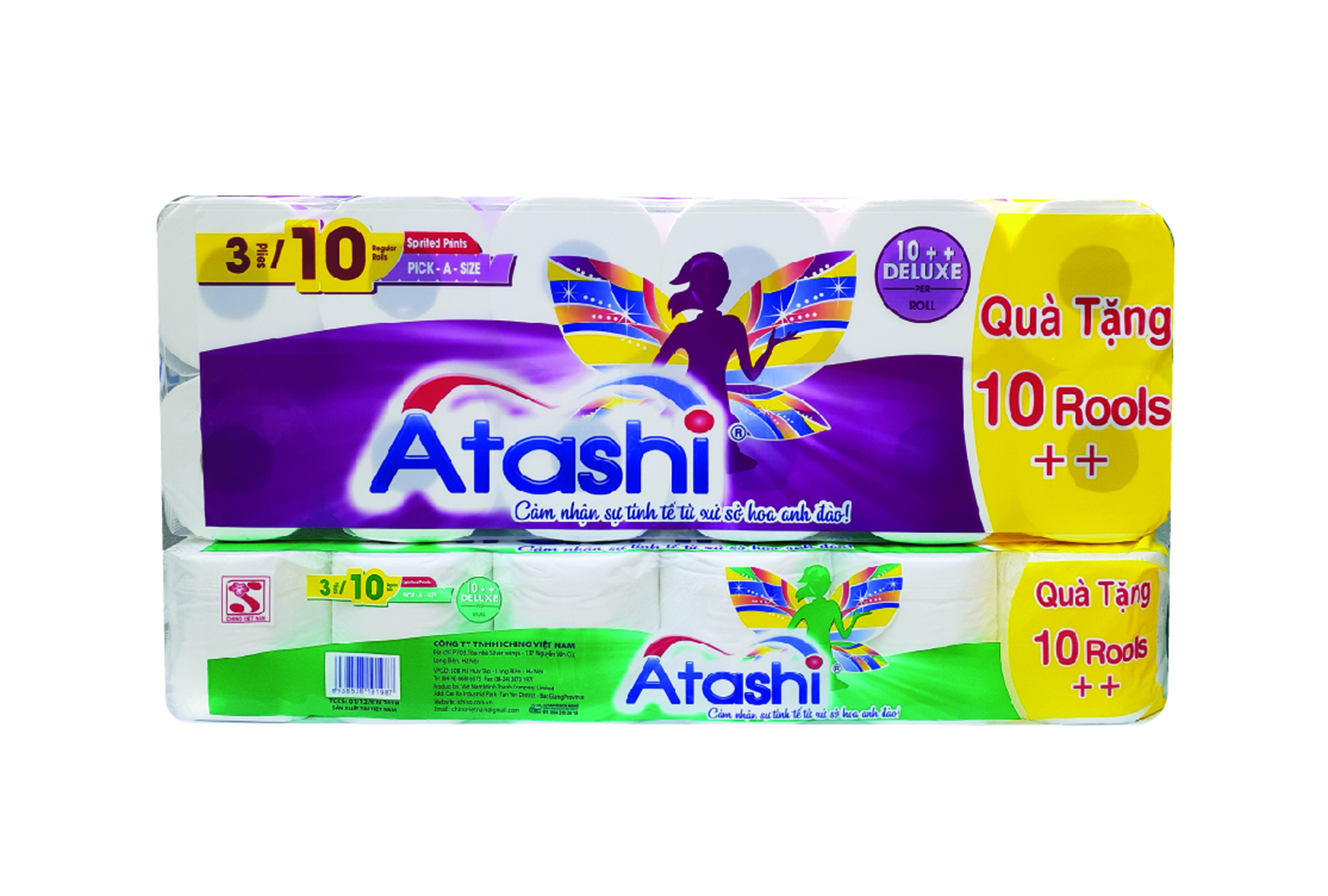 Giấy vệ sinh Atashi có cấu tạo 3 lớp dày dặn, tăng cường độ dai và khả năng thấm hút, giúp bạn sử dụng tiết kiệm hơn. Để đáp ứng nhu cầu đa dạng của người dùng với 2 loại giấy: có lõi và không lõi. Loại có lõi tiện lợi cho việc sử dụng trong gia đình, còn loại không lõi phù hợp để sử dụng trong nhà hàng, khách sạn hoặc những nơi có nhu cầu sử dụng cao.